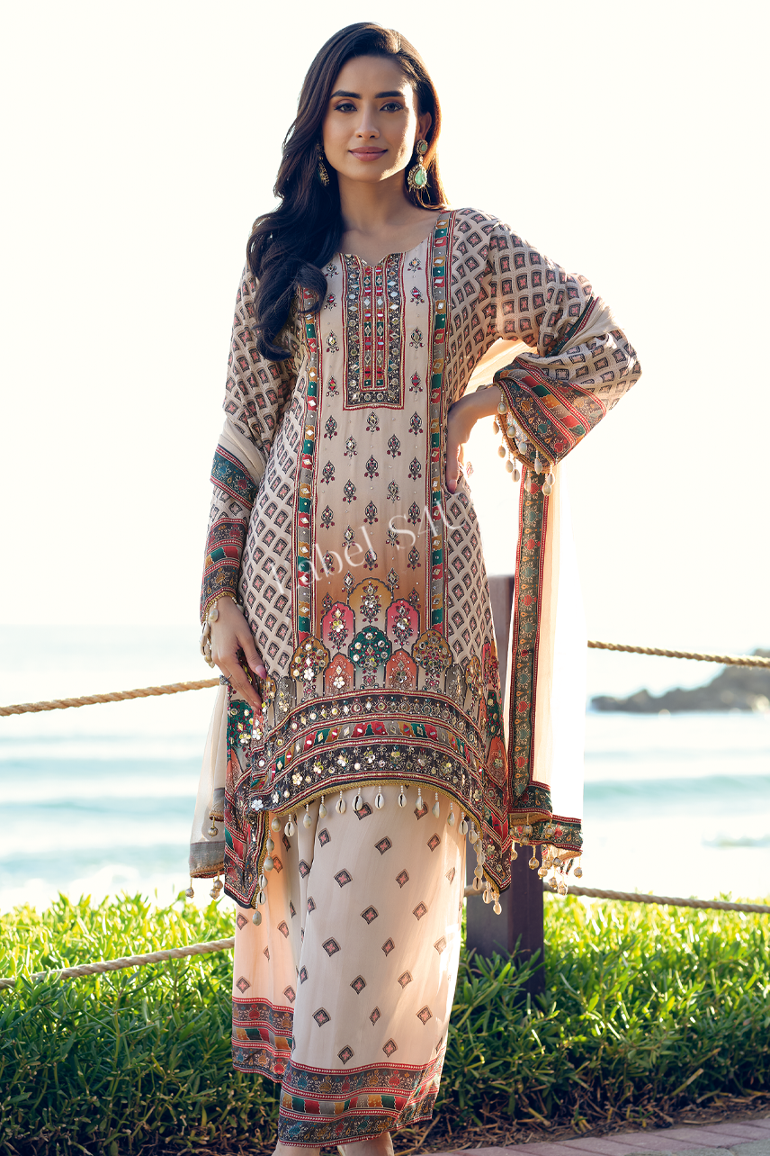 This beige suit set is a masterpiece of traditional craftsmanship, featuring detailed embroidery, and vibrant ethnic patterns. The flowy silhouette adds a regal charm, while the wide-leg palazzo pants and dupatta complete the elegant, vintage aesthetic. Perfect for festive occasions, weddings, and cultural celebrations, this suit embodies grace, grandeur, and timeless beauty.